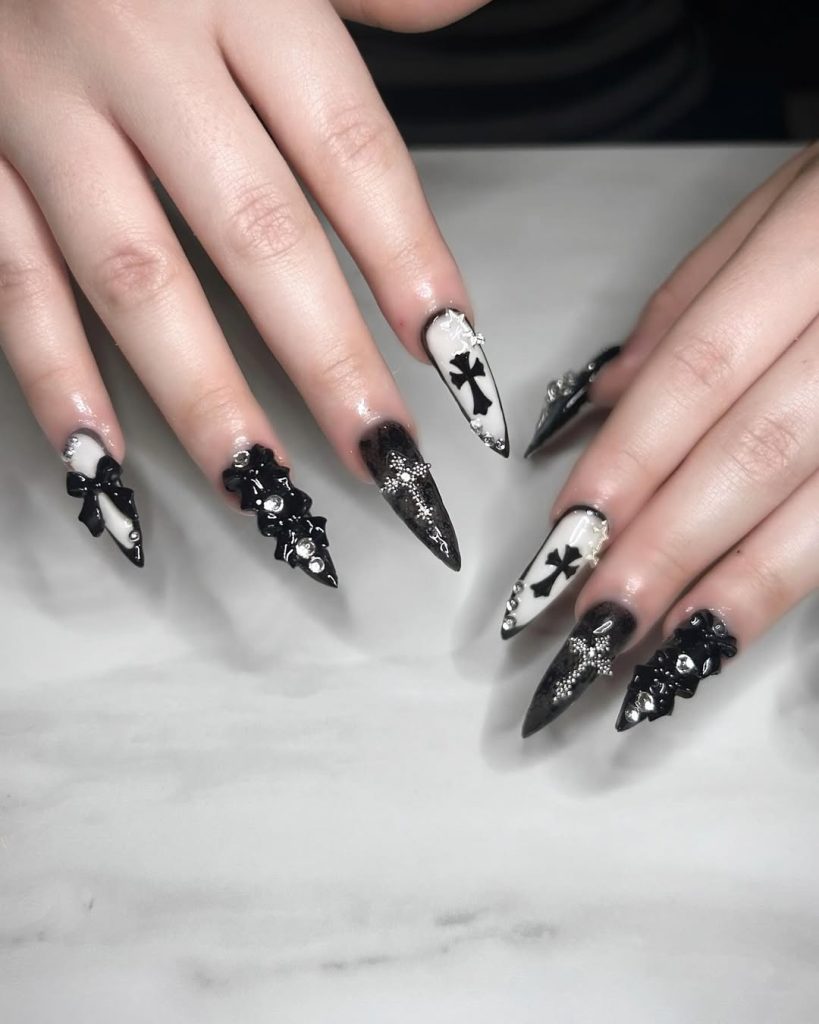 Black and white has always been the most striking Gothic pairing, and these nails prove it. Almond tips on point, hard contrasts, and bold crosses; they turn any hand gesture into a statement. Embellished with the textured bows and crystals, they finish this cute yet dark look that combines the Gothic tradition with a softer edge.
