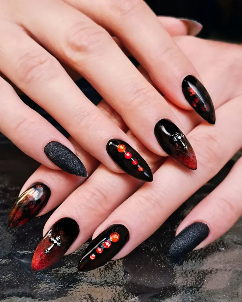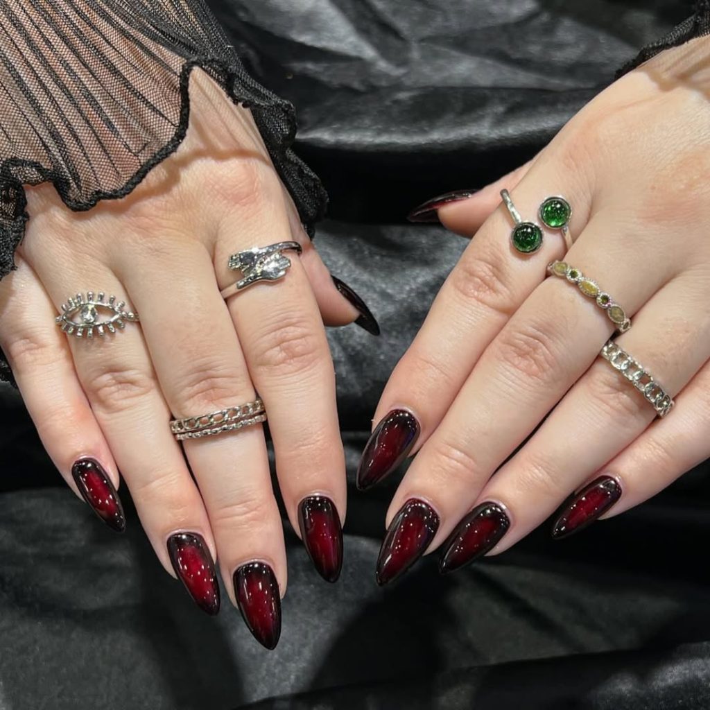 Best suited for long almond or stiletto shapes, this design works splendidly for anyone who adores a heavy but nonetheless highly refined Gothic inspiration. Red and black are timeless hues; therefore, these nails will prove to be apt for seasonal wear or standout occasions. They almost seem to say, “Here goes a standalone, powerful vibe,” with almost nothing to even accompany it — soberingly simple yet disgracefully unforgettable.