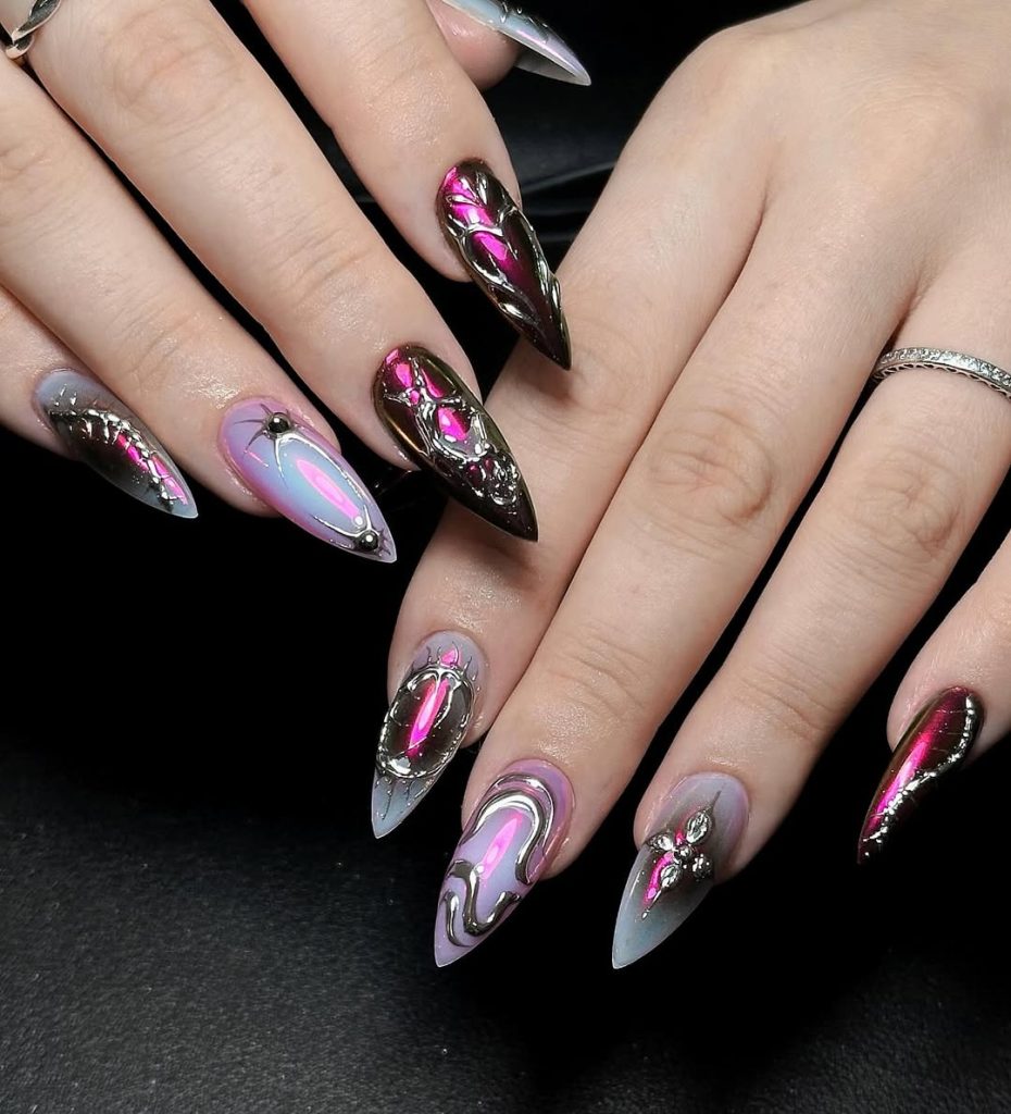 Gothic doesn’t always mean dark — sometimes it means futuristic. These nails mix metallic silver outlines with glowing pink holographic designs, creating an almost sci-fi Gothic effect. The swirls and reflective chrome details make them feel like modern art on your fingertips, blending cute with dark inspo.