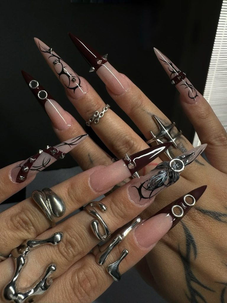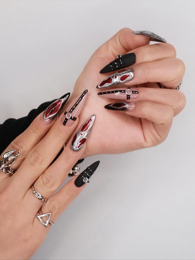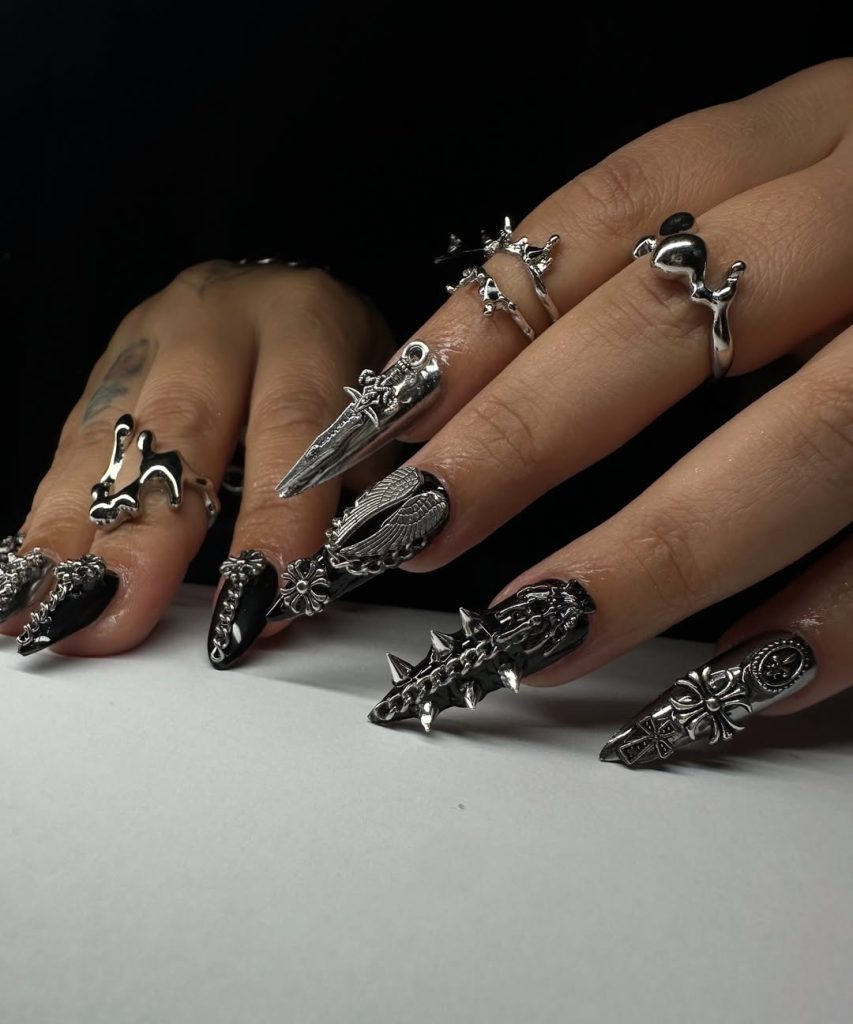 This look is perfect for women who love long, spiked nails and don’t shy away from making a statement. While they may not be the simplest everyday design, they deliver pure inspo for Gothic parties, edgy concerts, or when you want to feel like you’re wearing armor at your fingertips. A bold mix of art punk and Gothic ideas.