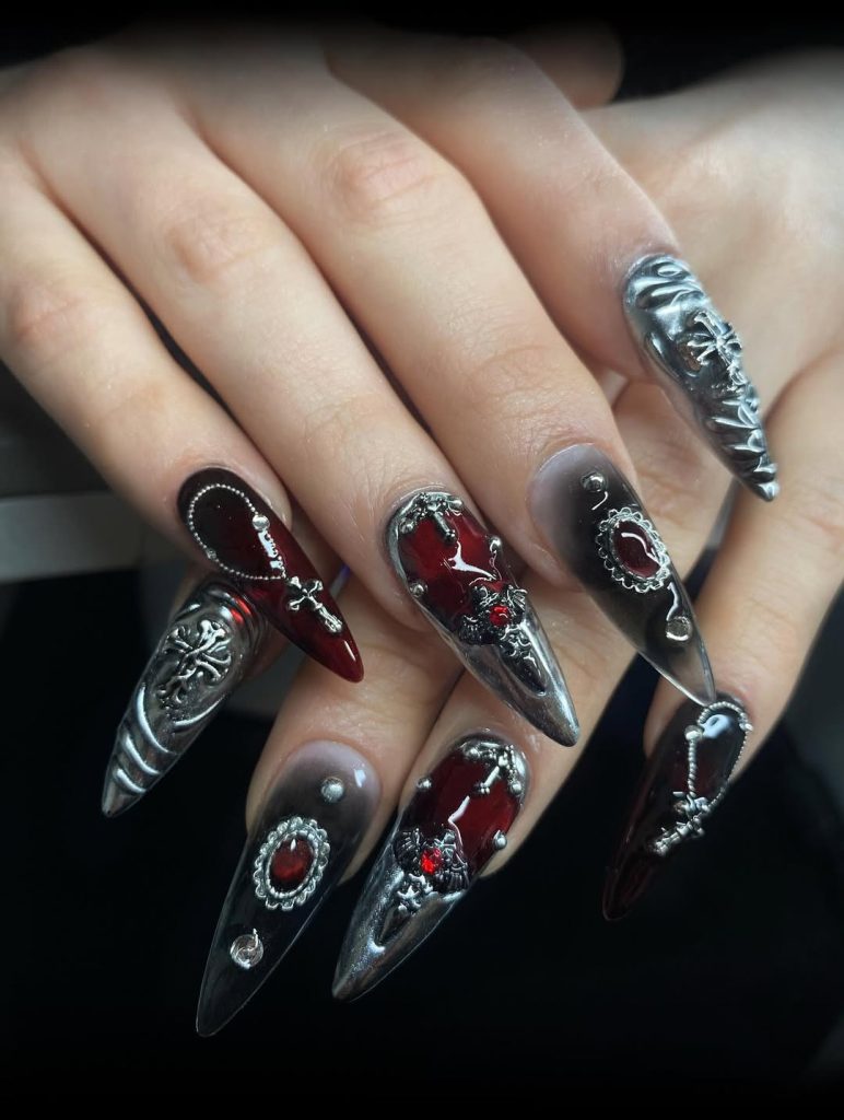 Molten silver meets fiery red in this Gothic masterpiece. The metallic details sculpted across the nails look like armor, while the deep red accents feel like drops of passion sealed in steel. Cross symbols and intricate engravings take the look further into Gothic fantasy — bold, dangerous, and strikingly elegant.