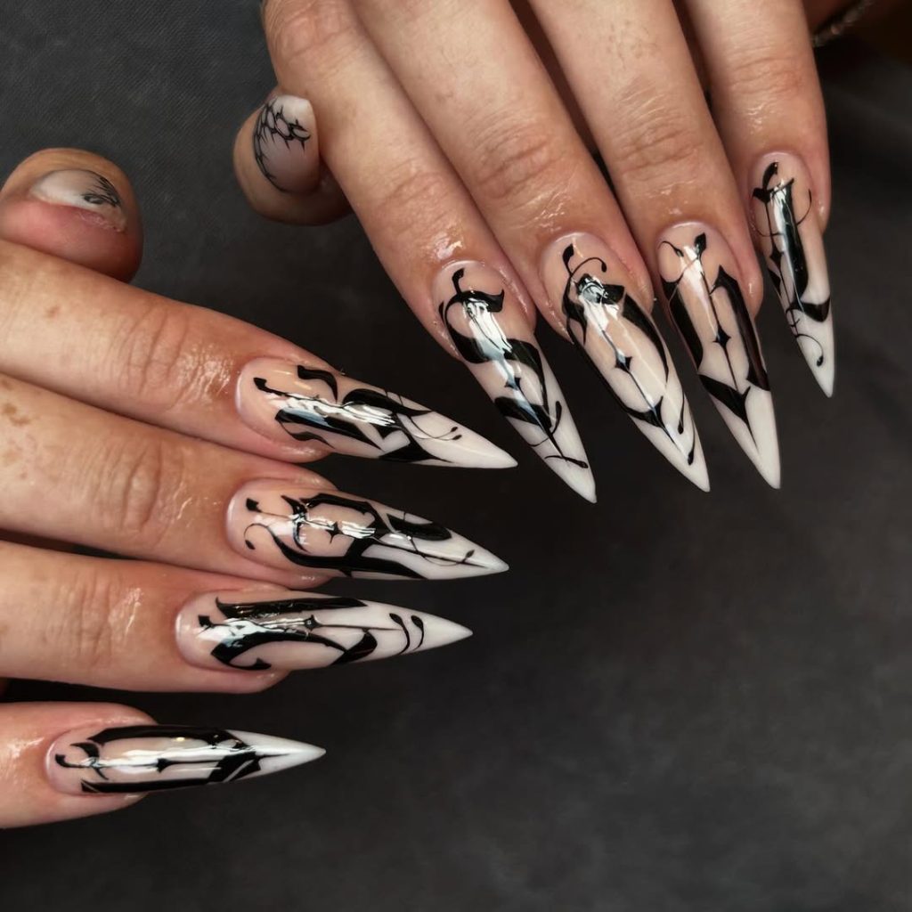 It creates an essence of Gothic calligraphy stark white base with flowing black script-like designs. They almost seem to come straight from the pages of an ancient spellbook-an art punk elevation from the upstream. The pointed stiletto shape intensifies their dramatic, sharp, and sleek nature.