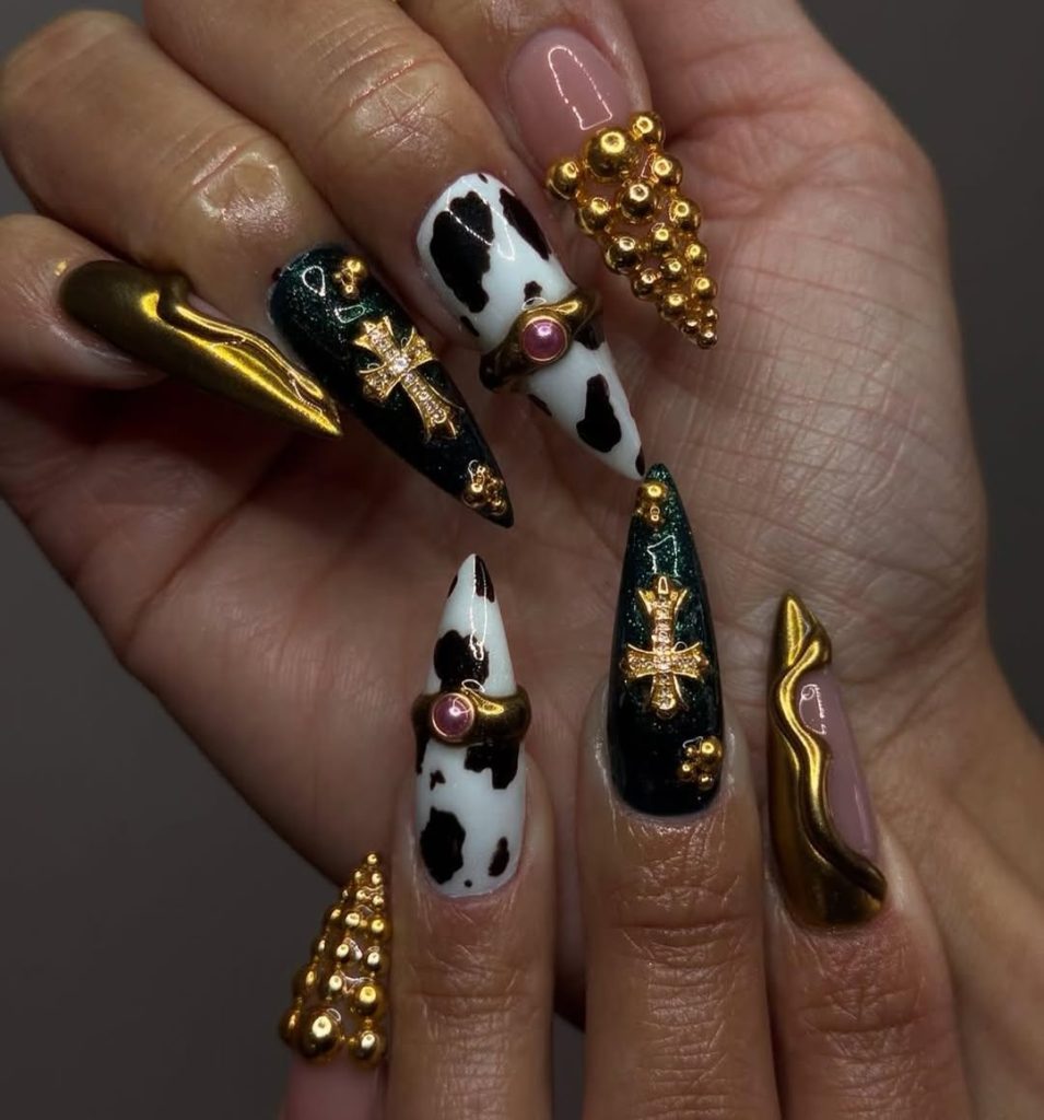 If nails could wear crowns, these would truly reign supreme. The mix of cow-print patterns, metal gold-plated sculptures, and pink gemstone accents presents that bold, unique, character-filled regal gothic vibe. It leans toward Southern Gothic aesthetics: luxurious, a tad rebellious, and downright unforgettable. Even with the glistening crosses and textures, each detail is a story.
