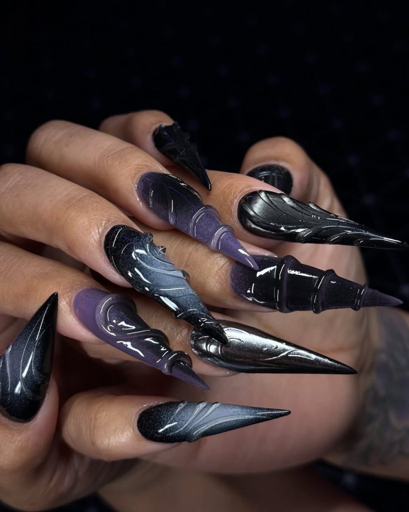 These nails resemble dark angel wings sculpted in polish-an amalgamation of metallic black, smoky purple, and sharp dimensional shapes that feel otherworldly. Each nail is textured with feathers and curves and gives depth and movement. This is the mightiest form of Gothic fantasy, like carrying the nighttime sky on your fingertips.