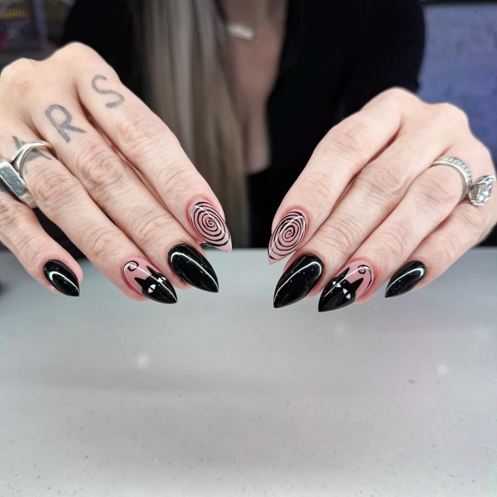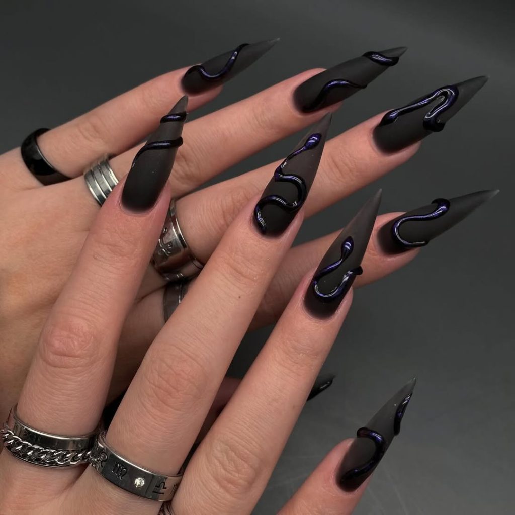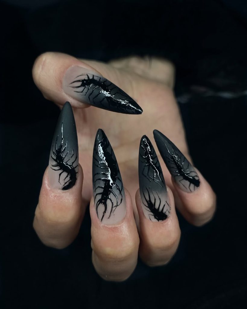 Dark, mysterious, and hauntingly beautiful, these nails feature black ombré bases with glossy spider-like art crawling across the surface. The sharp almond tips and monochrome color palette make them sleek yet terrifyingly chic. It’s Gothic inspo at its most subtle — eerie without losing sophistication.