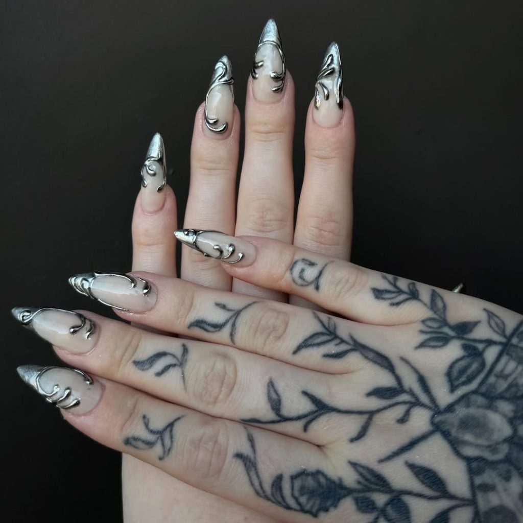 These nails give you a molten-silver-dipping look. On a nude base with fluid, metallic swirls, they feel futuristic as well as Gothic-a softer way of saying, “wearable armor.” Elegance and industrial vibes converge with the design that is bold as well as refined.