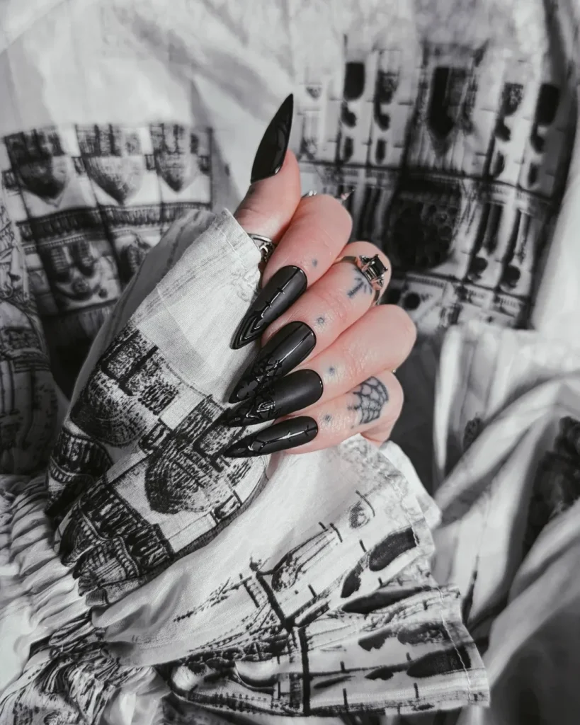 For a woman who loves Gothic inspo that feels somewhat minimal but equally potent, this design looks stunning on long nails and lends the final dramatic touch. This look crosses the line between everyday wear and striking-worthy nights out. It is a go-to look for anyone who wants laggy, artistic vibes without components that feel heavy.