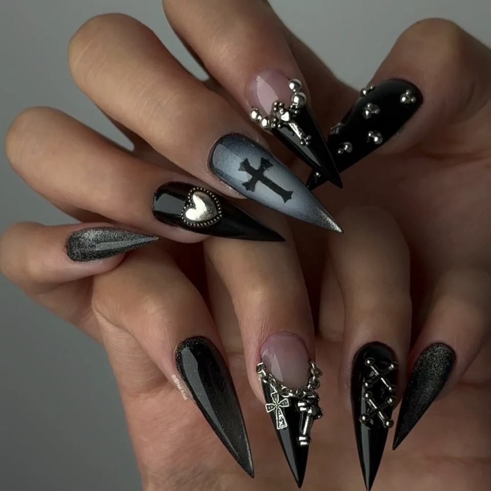 An interplay of silver crosses, chains, and metallic embellishments turn them into black stiletto nails mocked up as Gothic jewelry. Every nail is dark art balanced by smooth gradient shades of gray with a pinch of shimmer. They are strong, symbolic, and steeped in Gothic attitude.