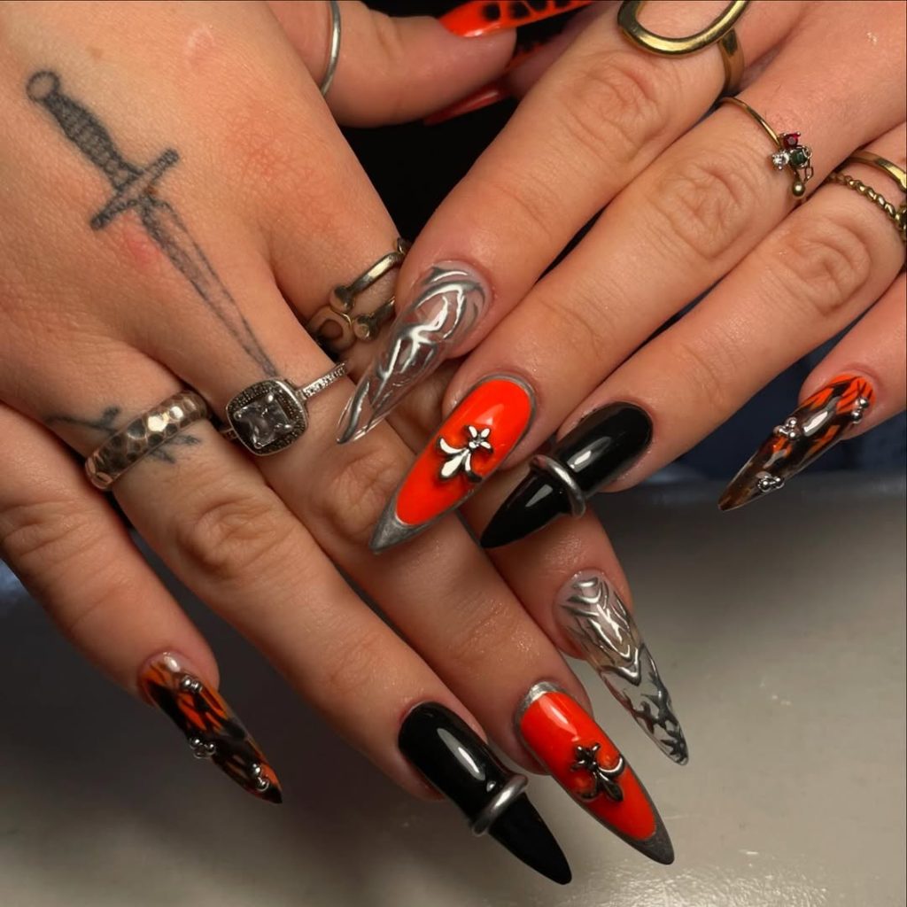 When you need an effect for a summer festival night or one in which your hands get to articulate, this representation applies to anybody who adventures in thought. Red and black mixed with silver-made nails stand out for all skin tones, and the very strong Gothic influence keeps them styling with a shadow of darkness. Actaully these are nail arts that stand to bear emotion and radiate an aura of fearless energy.
