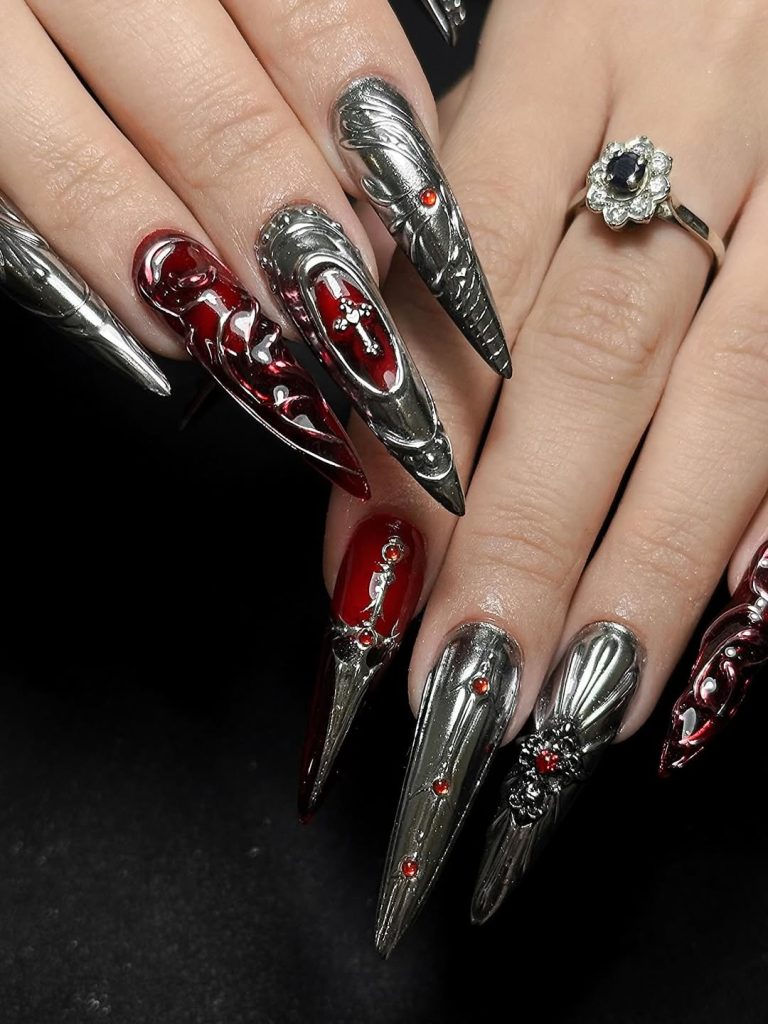 Best for long pointed acrylic nails, this set is for those who want to feel powerful with dramatic art. The red-and-silver combo is particularly stunning for evening wear, Gothic events, or whenever you want to feel unstoppable. It is not just nail art — it is an entire vibe, a mood, and a statement.
