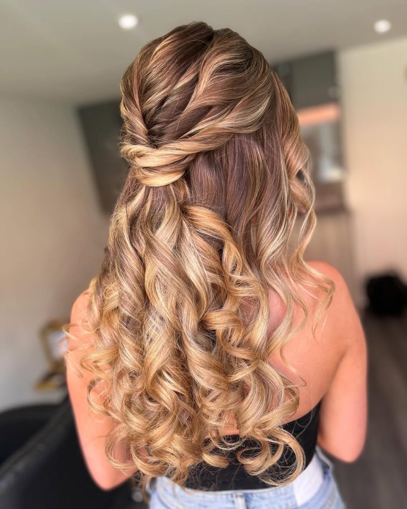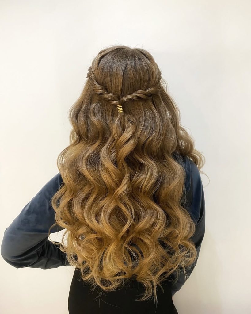 This half-up style feels soft, romantic, and quietly charming. The twisted sections pull the hair gently away from the face, while the rest of the length falls in defined curls down the back. It has a delicate, almost storybook quality that feels warm and approachable, perfect for women who enjoy subtle details.