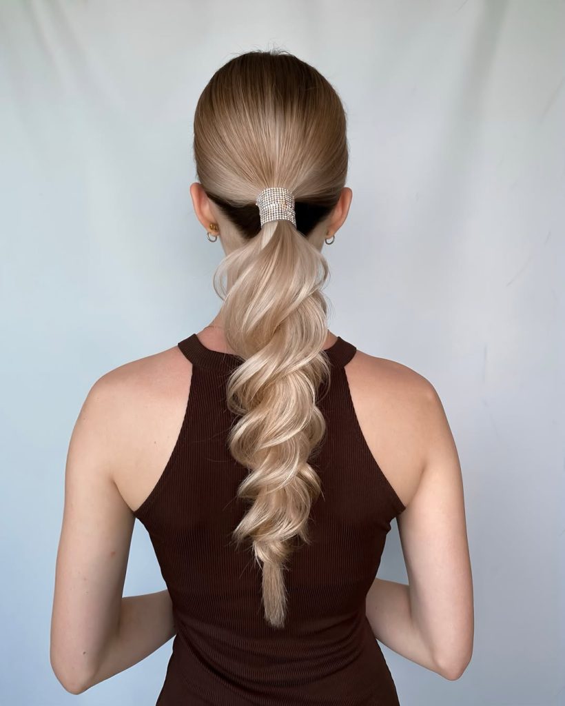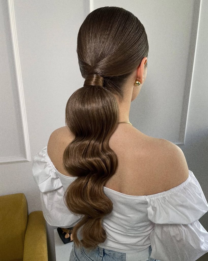 This hairstyle is ideal for wedding guest occasions or for weddings themselves. It suits straight to curly hair and works especially well on longer-length hair that holds a wave. A smoothing product at the roots and careful wave definition through the ponytail keep it polished yet relaxed.