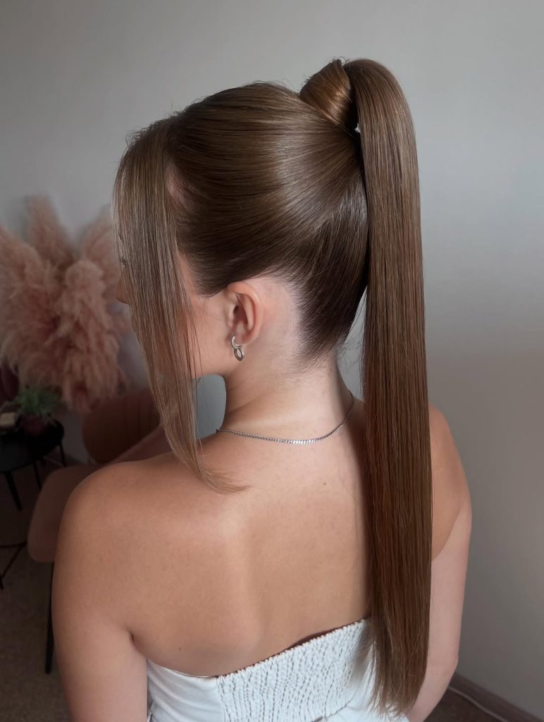 This look is confident, modern, and beautifully minimal. The high ponytail instantly lifts the face and elongates the neck, while the long, smooth length adds drama without excess. The face-framing strands soften the style just enough, giving it balance and wearability. It’s bold in its simplicity—a hairstyle that says you know exactly what you’re doing.
