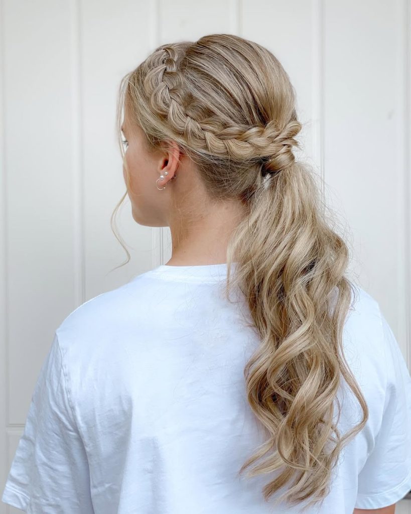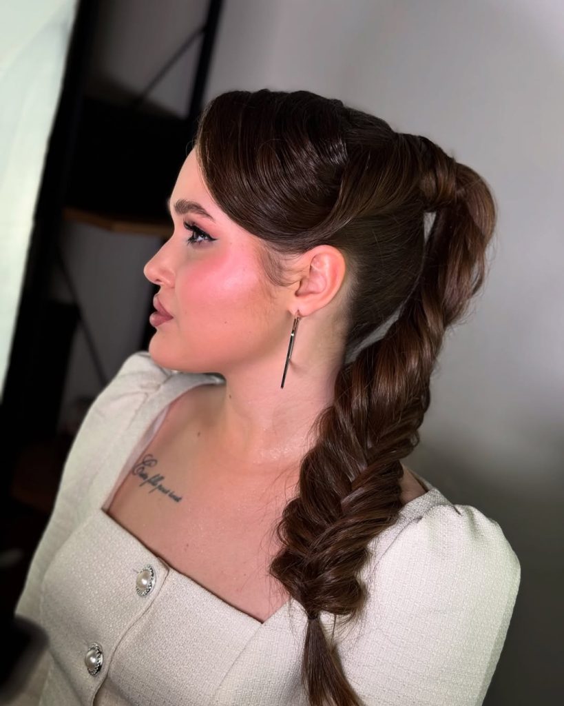 This style is ideal for women with straight or slightly curly hair who enjoy pulled-up looks that still feel feminine. It’s a wonderful choice for a party or prom moment, and it works well when you want your hair completely up but not severe. A smoothing cream at the roots and a firm braid keep everything polished, while loose strands keep it wearable and flattering.