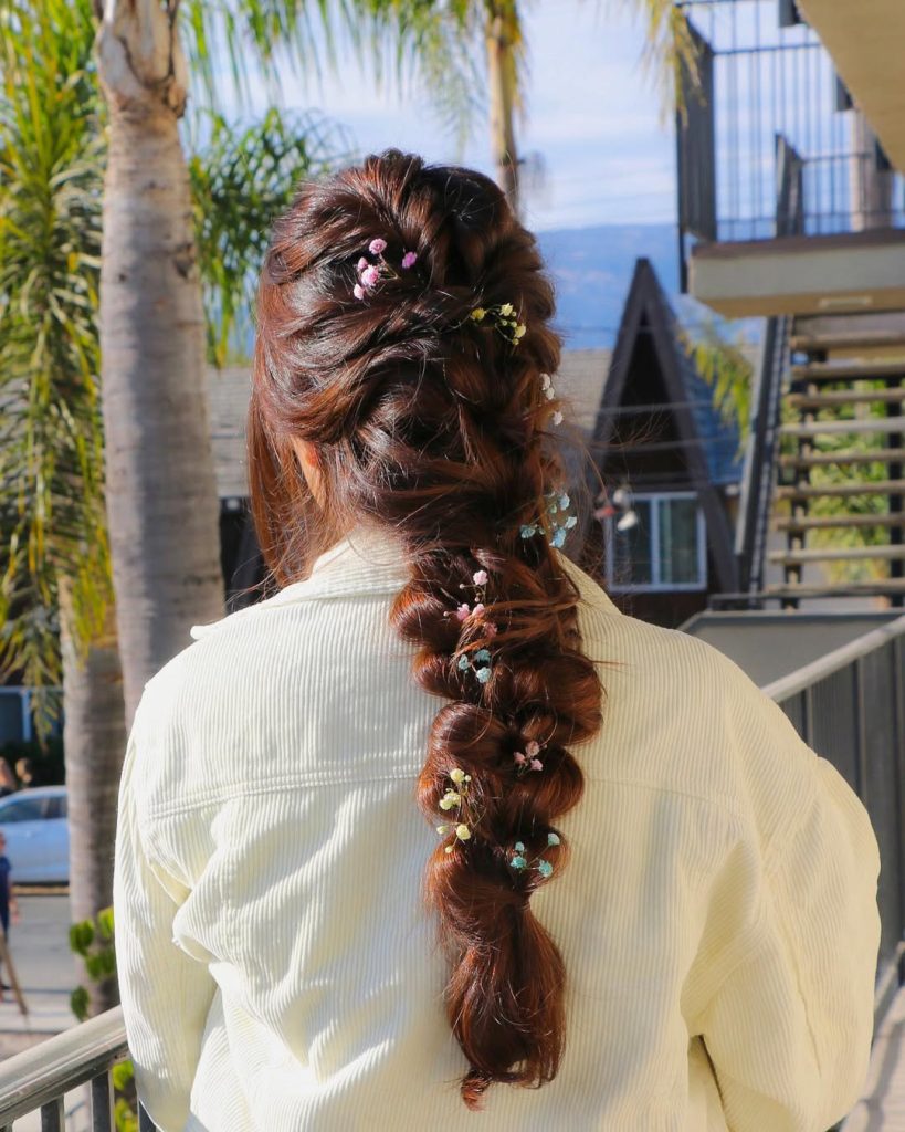 There’s something very poetic about this long braided ponytail. The braid feels soft and dimensional, while the gentle floral accents add a dreamy, almost storybook quality. It’s romantic without being overly precious, and it celebrates long-length hair in a way that feels thoughtful and personal. The braid style is the kind of hairstyle that instantly feels special, perfect for meaningful moments.