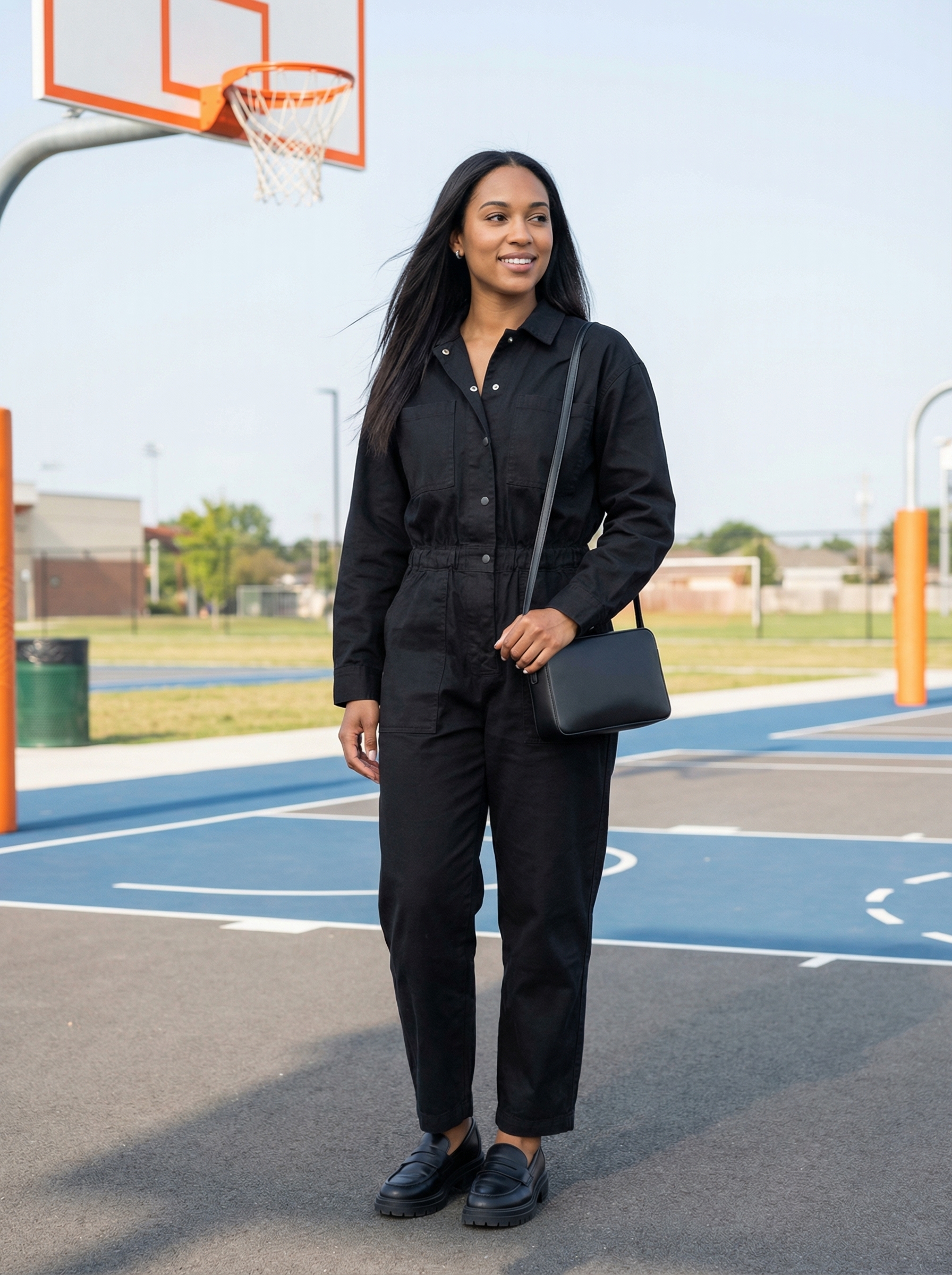 Too high maintenance? Perhaps you need something that holds up better to actual life. This ‘Athletic Brunch Date’ outfit merges comfort with an undeniable chicness, perfect for those extended casual dates where you want to look put-together yet utterly relaxed. The black wide-leg jumpsuit with a light wash denim jacket layered over it offers a fantastic blend of modern sophistication and easygoing style. White platform sneakers anchor the look, giving it a fresh, urban edge.