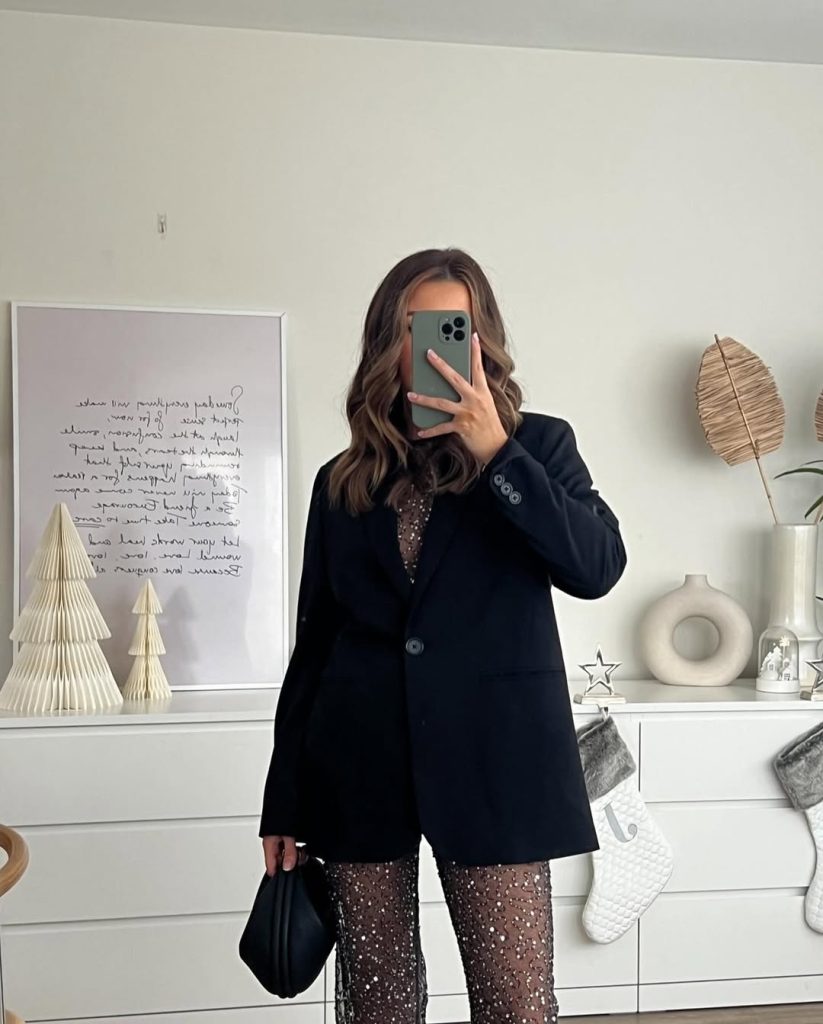 This outfit radiates the daring spirit of freshers parties, upscale night lounges, or a spirited casual Christmas gathering where sparkle is the unofficial dress code. I love how the blazer tones down the drama just enough, giving the look versatility—it can go from edgy nightlife to a rooftop dinner by adding sleek heels. Avoid pairing with a busy patterned coat; let the shimmer take center stage.
