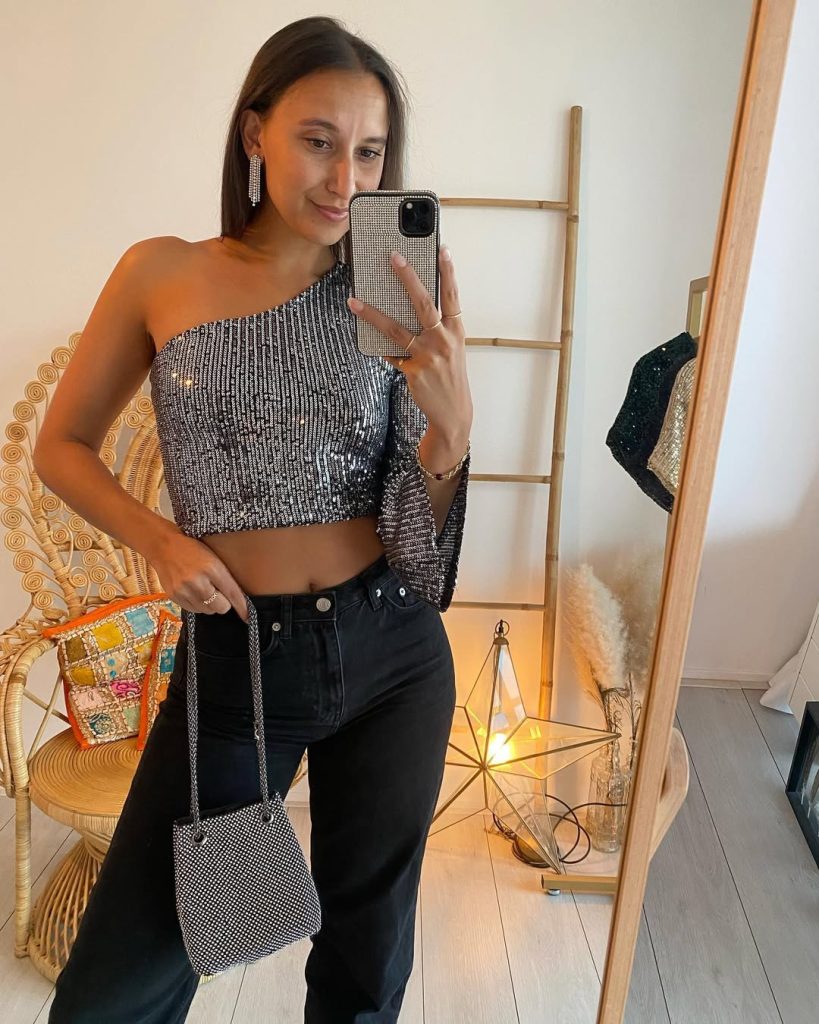 Black jeans complement this top perfectly. At the same time, it provides a contrast to the glam look that this top creates. It is usable for the night, casual, or for a nostalgic 2000s vibe that consisted of sparkly, eye-catching outfits.