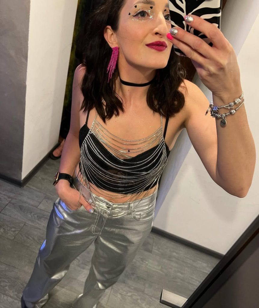 A futuristic combination of a chain-draped crop top and metallic silver trousers—perfect for Disco, 2000s, or sparkle-focused nightclub celebrations.