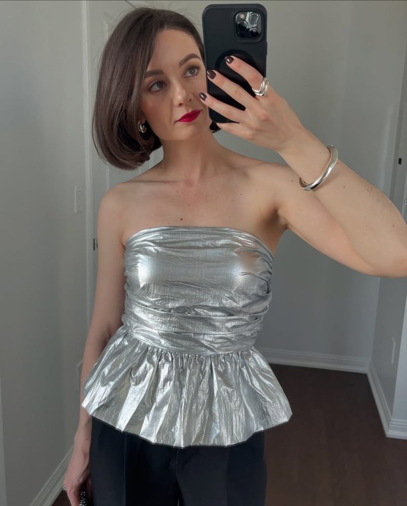 A futuristic metallic peplum top paired with tailored black trousers is a perfect fit for dinner, cocktails, 2000s throwback parties, and rooftop summer events.