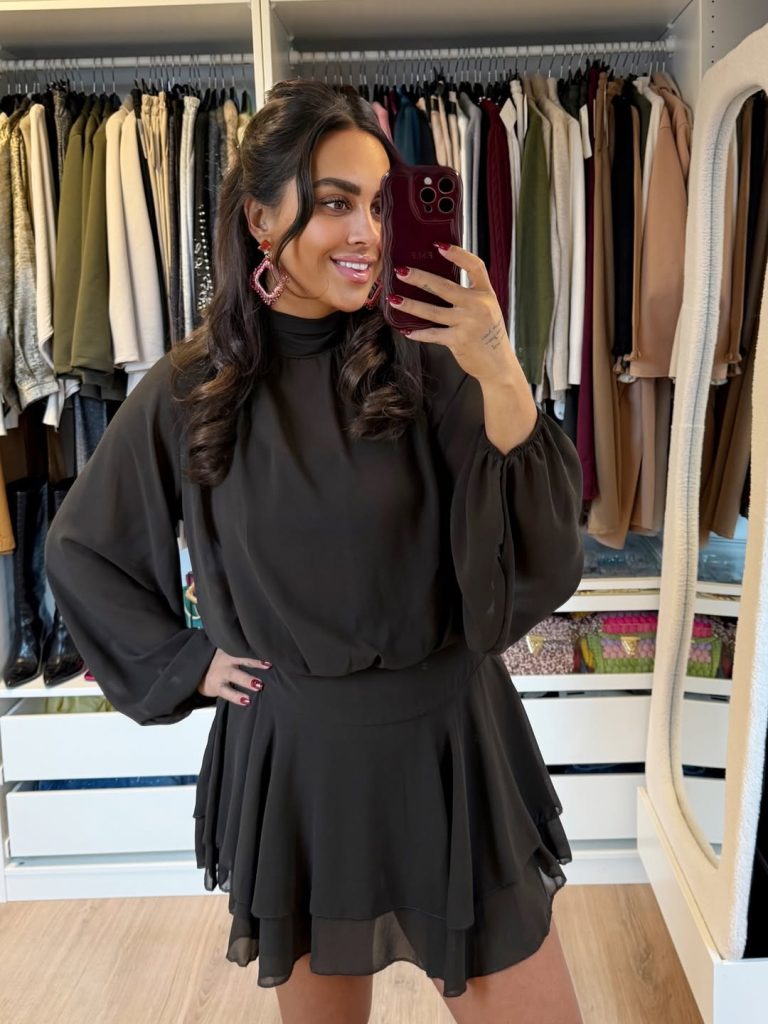 A flowy black chiffon mini dress with romantic sleeves and a soft high neckline—perfect for dinner, intimate house gatherings, or elevated casual events where understated polish is key.