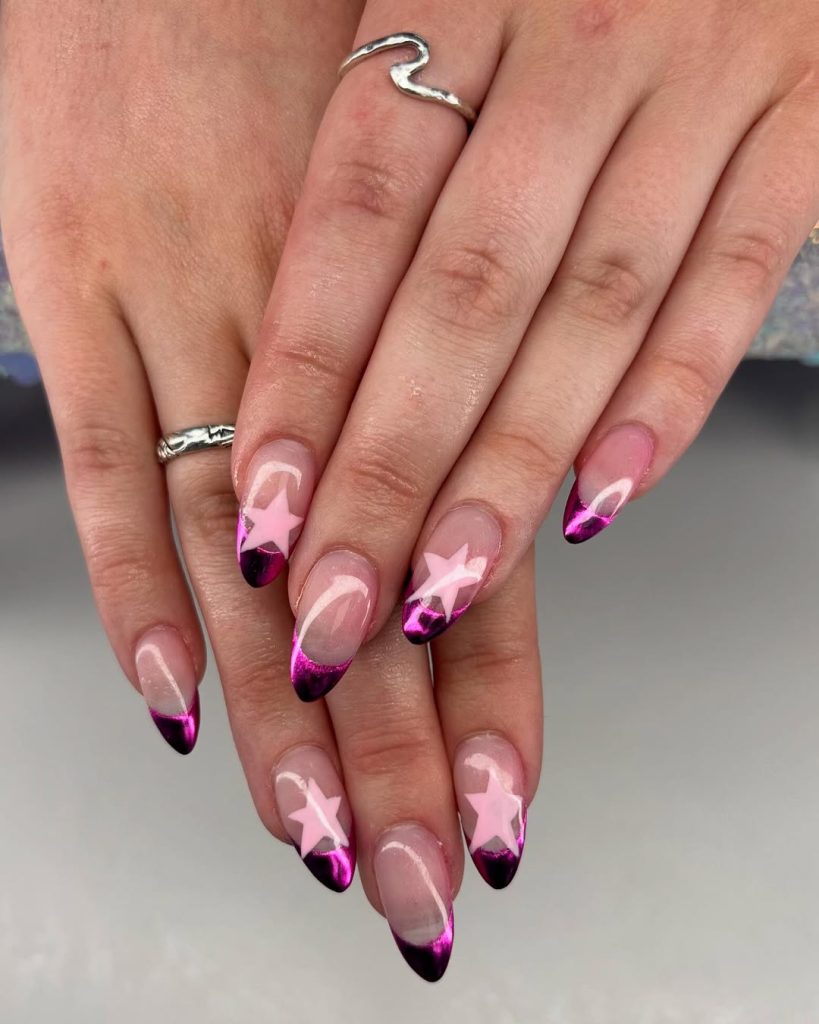 10. Pink chrome French tip nails with stars