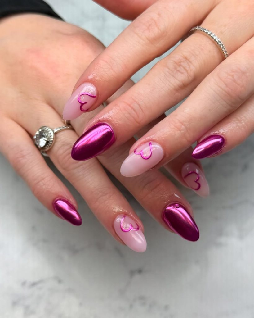 Flirty, romantic, and irresistibly sweet—these pink chrome nails with heart accents are pure love in manicure form. The mix of rich metallic pink and soft blush tones creates a perfect contrast that feels both playful and elegant. Each tiny heart adds a touch of artful charm, making this look ideal for date nights or Valentine’s inspo.