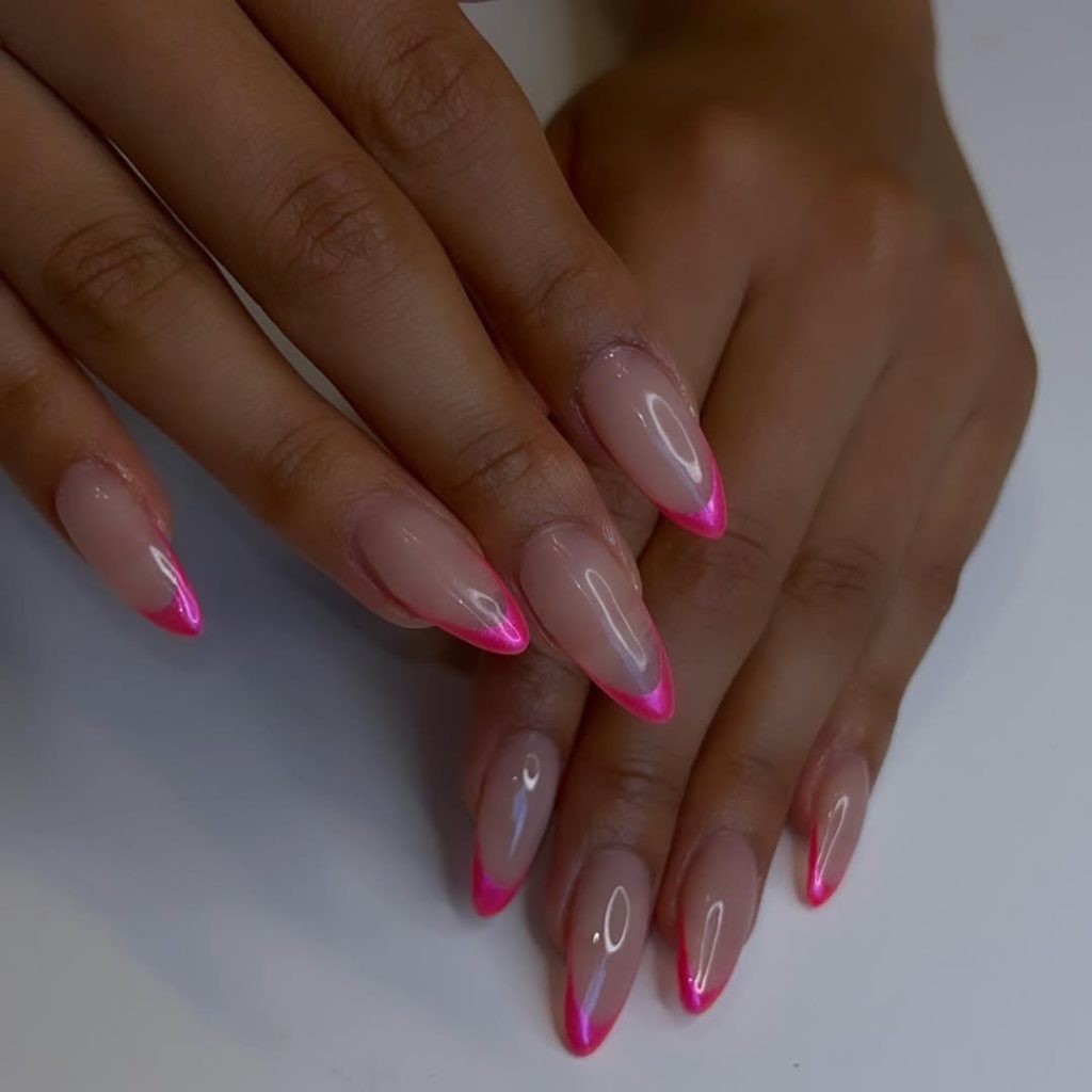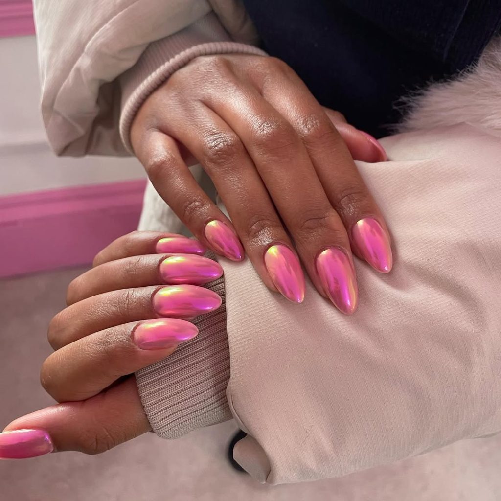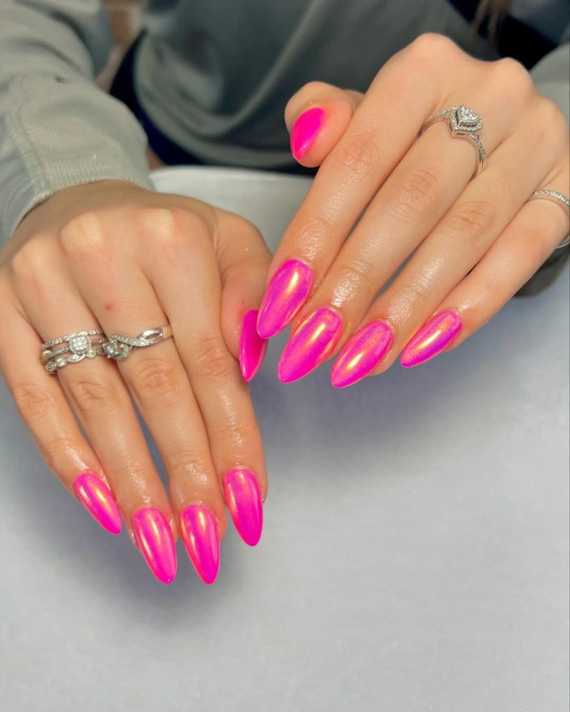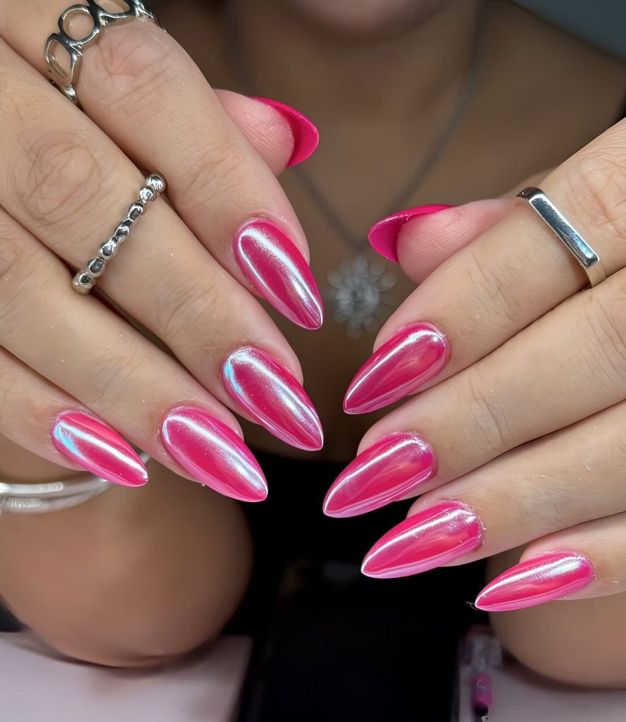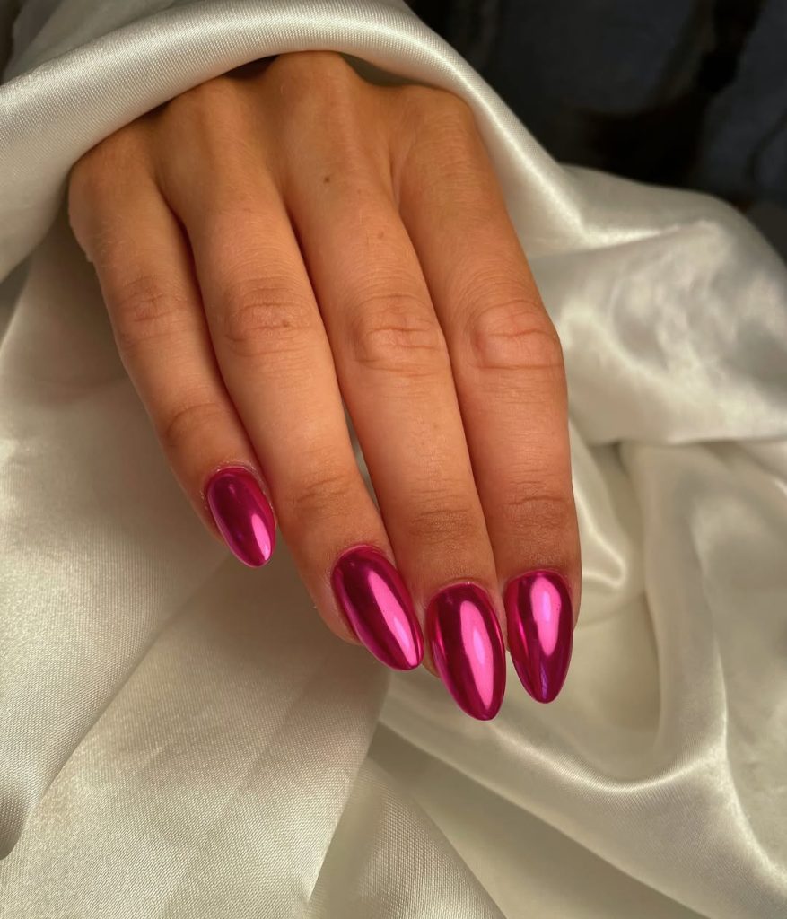 2. Hot pink chrome almond nails