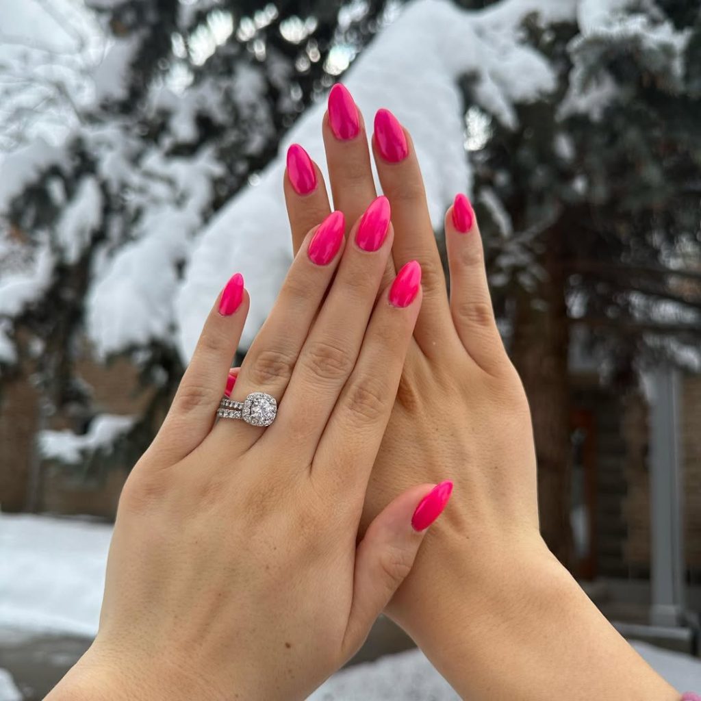 These neon pink chrome nails practically glow in the snow—bold, vibrant, and full of confidence. The electric hue catches every ray of light, giving your manicure a stunning mirror finish that feels both fresh and powerful. It’s like wearing summer energy on your hands, no matter the season.