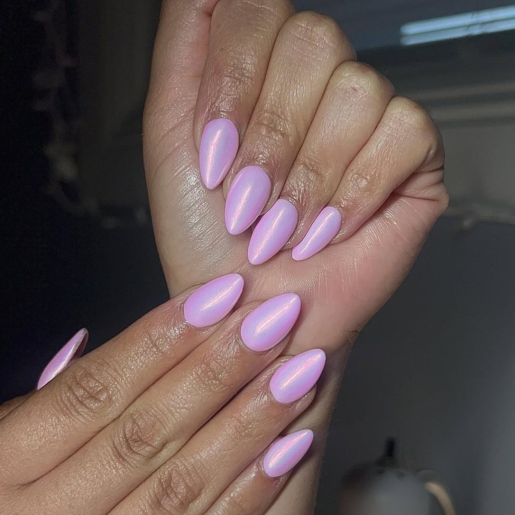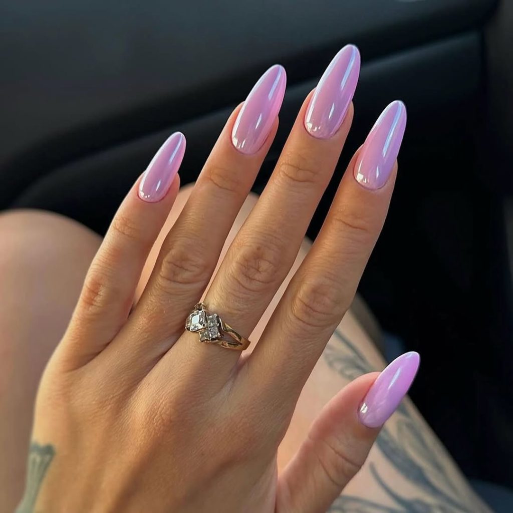 These nails offer the most exquisite example of understated luxury. The milky pastel chrome finish, along with the smooth and mirror-like finish, creates a gentle but assured radiance. It is a perfect manicure for someone who wants to shine but still keep things subtle, having a soft, polished, and angelic appearance without being too bright. The soft, light reflection has a satin finish under bright light, which adds to the refinement of the manicure.