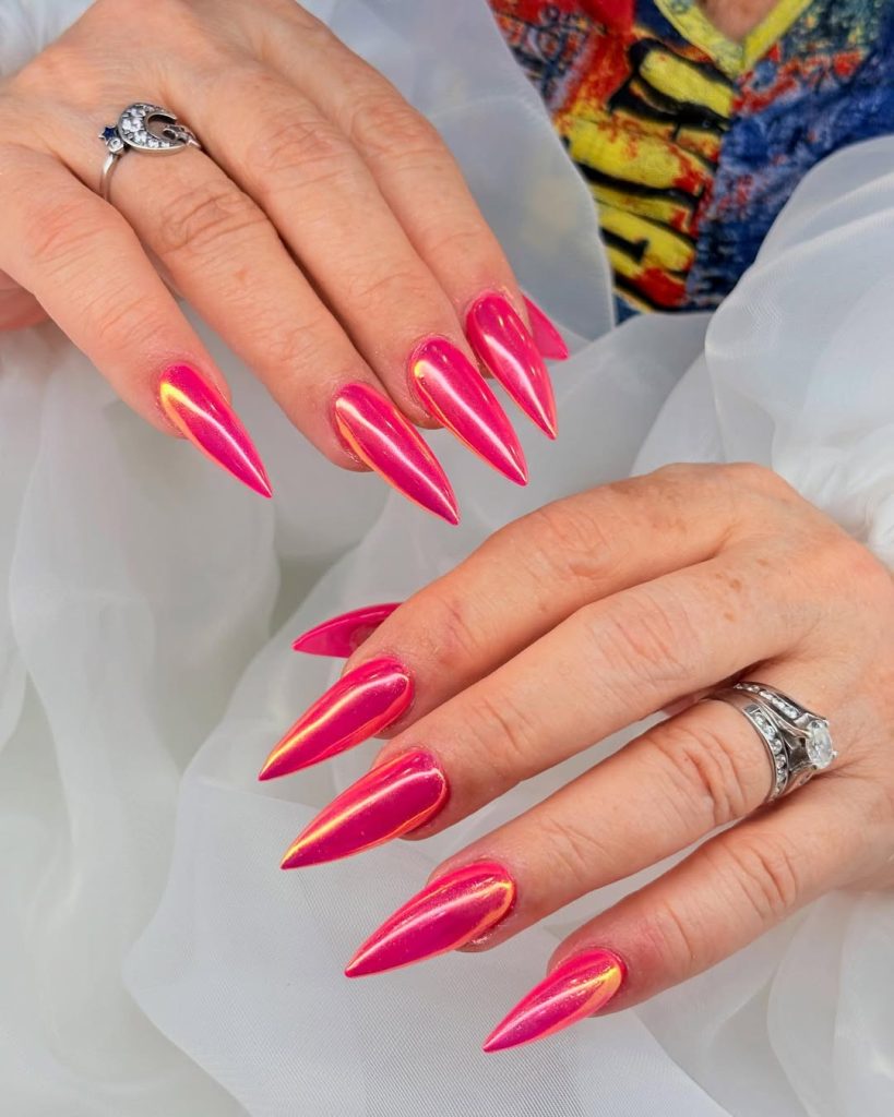 These hot pink chrome stiletto nails are pure attitude—bold, unapologetic, and full of energy. The high-shine finish and fiery undertone shift between pink and orange, catching light like molten metal. They scream summer, confidence, and pure fun—the kind of nails that deserve to be shown off with bright rings and a fresh tan.