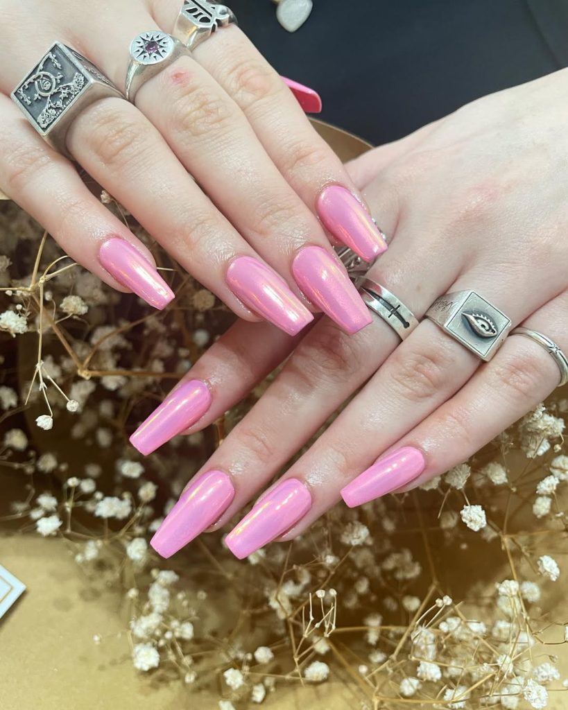 There’s something undeniably dreamy about these pink chrome coffin nails—soft shimmer, delicate pearls, and a tiny butterfly charm that feels straight out of a fairytale. The mirror-like glow catches the light with every move, making this manicure pure Barbie glam with a touch of sophistication.