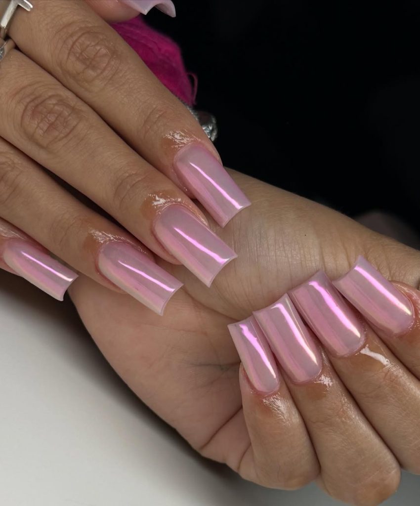 For a minimalist yet ultra-modern look, these pale pink chrome nails are pure sophistication. The square shape adds a clean, structured edge, while the reflective chrome sheen makes the color feel luxe and polished. It’s the perfect blend of neutral and statement—understated enough for the office but eye-catching enough for a night out.