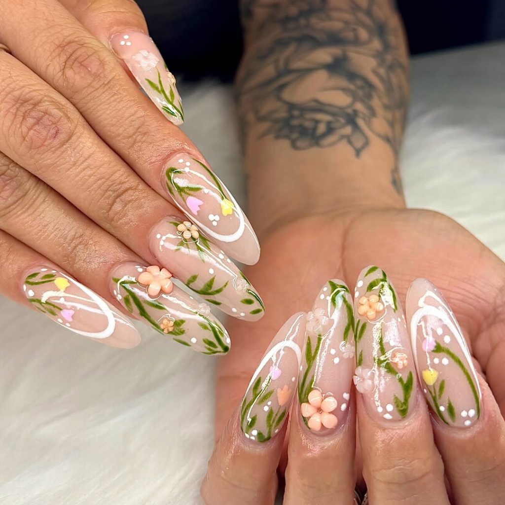 This look is perfect if you’re drawn to designs of flowers that feel organic rather than overly polished. Almond shapes give the design space to breathe, especially on long nails. It suits anyone who loves simple Inspo styles with a soft, nature-inspired mood and works beautifully for everyday wear in 2026.