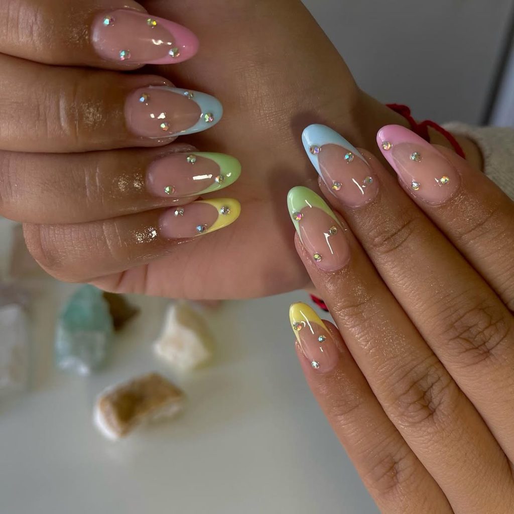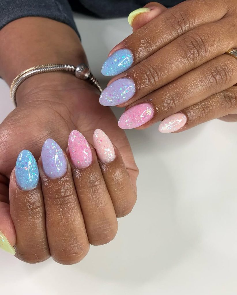 13. Pastel Glitter Almond Nails in Mixed Spring Colors
