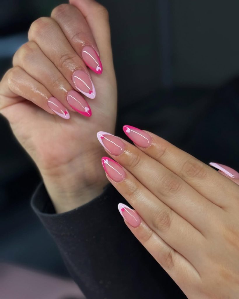 This design, sweet, flirty, and surprisingly chic, adds a modern twist to the classic pink almond nails. The clean French outline keeps things polished, while the tiny heart accents add personality and warmth. It feels romantic without being over-the-top, making it easy to wear and instantly charming.