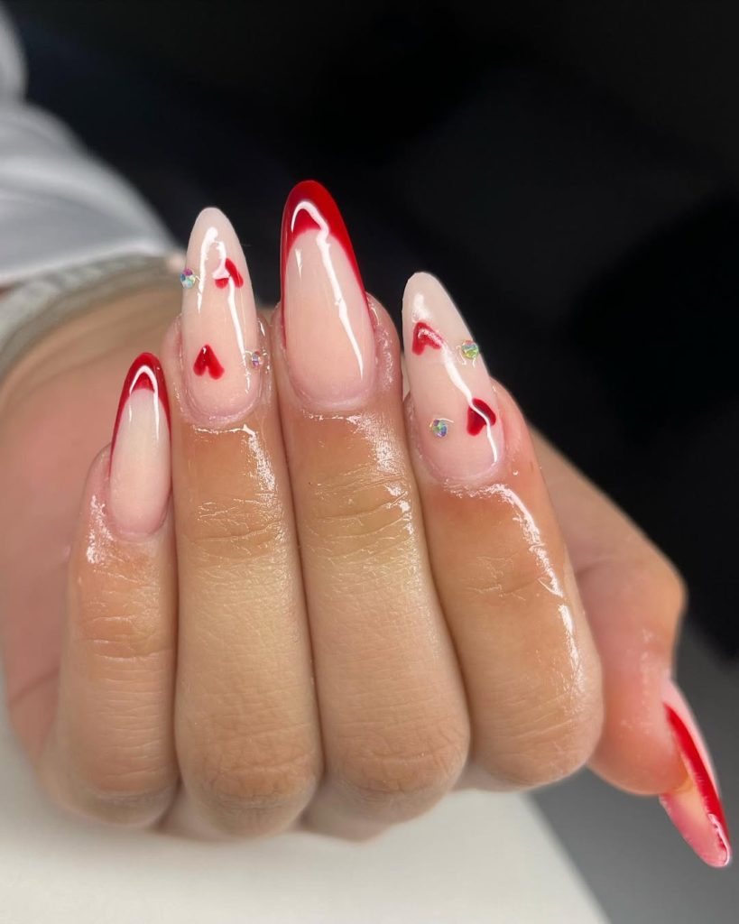 Bold yet polished, this manicure makes a confident statement. The rich red tips bring energy and drama, while the heart details soften the look just enough. It’s powerful, feminine, and full of personality—perfect for days when you want your nails to feel intentional and expressive.