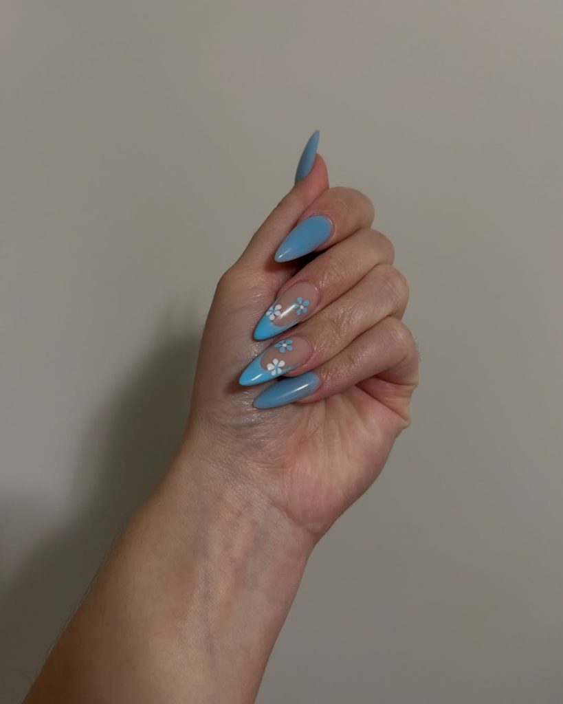 16. Sky Blue Almond Nails with Minimal White Flower Accents