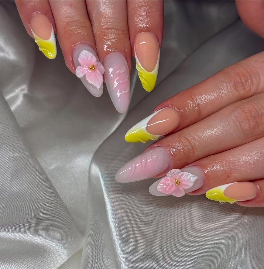 Warm, cheerful, and full of spring energy, this manicure feels like the first sunny morning of the season. The pastel yellow tips add brightness without overpowering the natural base, while the delicate floral accents soften the look and keep it elegant. It’s a joyful balance of freshness and femininity that instantly lifts your mood.