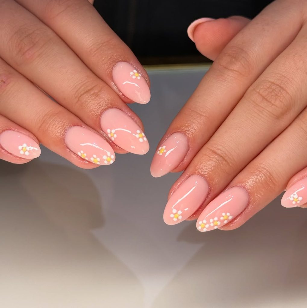 19. Soft Pink Almond Nails with Tiny Daisy Accents