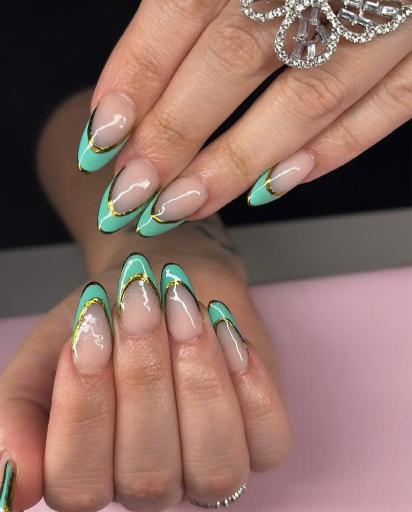 This style stands out among Designs 2026 for its balance of color and structure. Almond nails enhance the sleek lines, and the gold accent keeps the green feeling luxurious rather than casual. It’s a beautiful Inspo option if you want something unique yet effortlessly chic for spring.