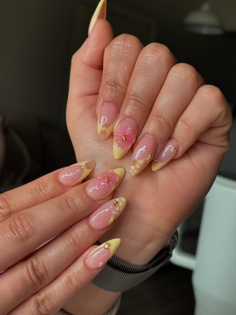 22. Soft Pink and Pastel Yellow Almond Nails with Floral Details