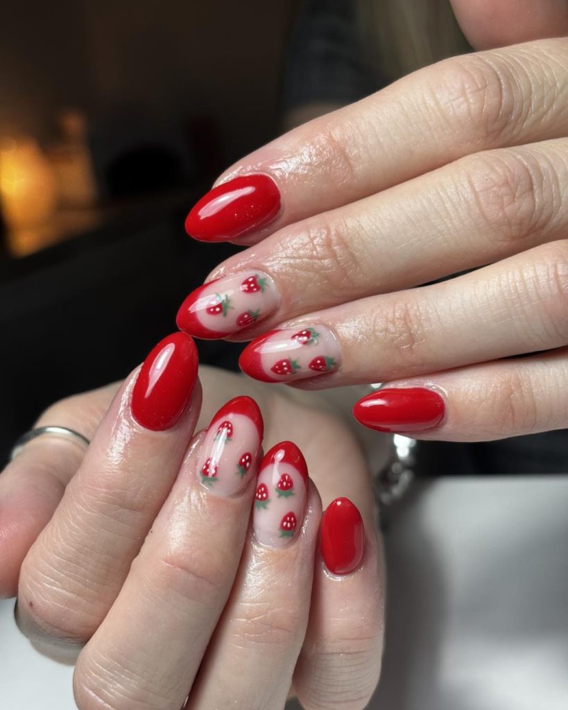 Fun, flirty, and full of character, this manicure instantly brings a smile. The glossy red nails feel classic and confident, while the tiny strawberry details add a playful twist. It’s charming without being childish—a design that feels youthful, creative, and full of spring energy.