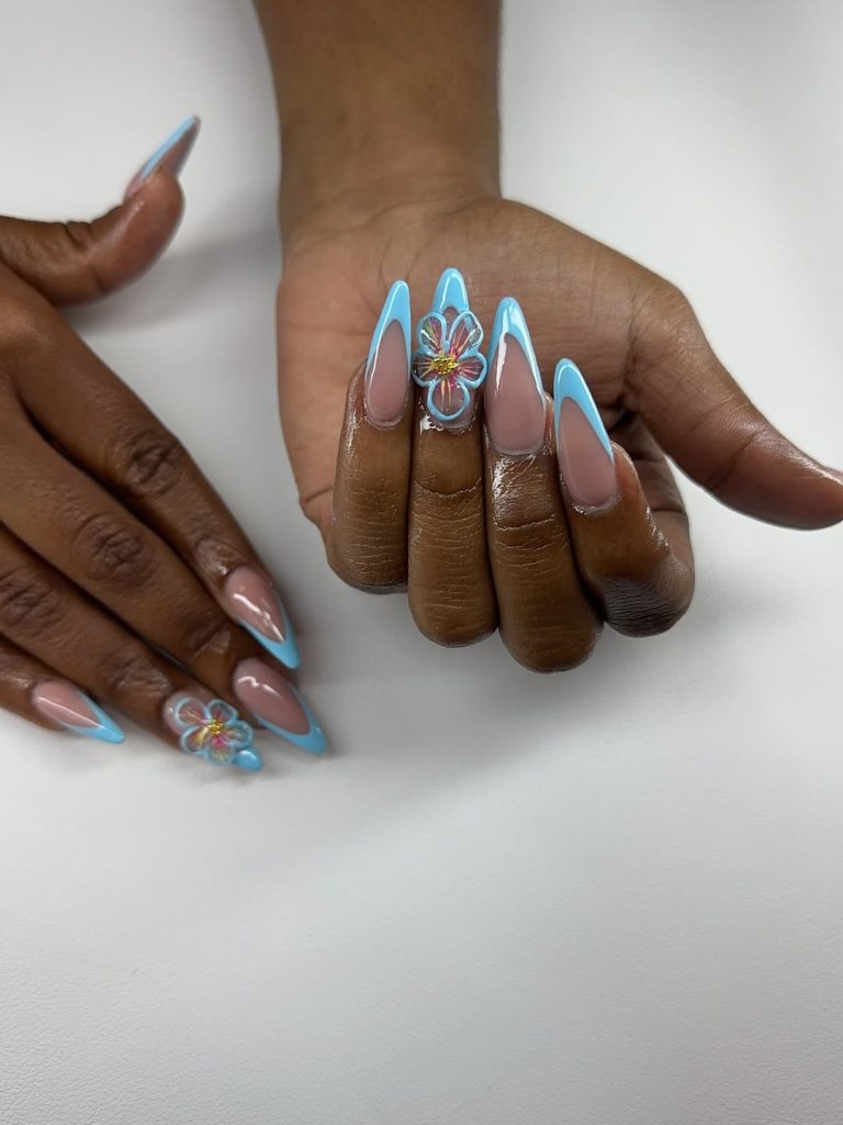 These nails feel modern, artistic, and confident. The clean blue French tips give structure and freshness, while the raised floral accent adds a sculptural, statement detail. It’s a look that feels intentional and fashion-forward, perfect if you enjoy nails that feel like wearable art.