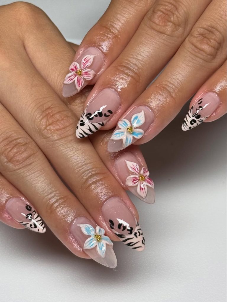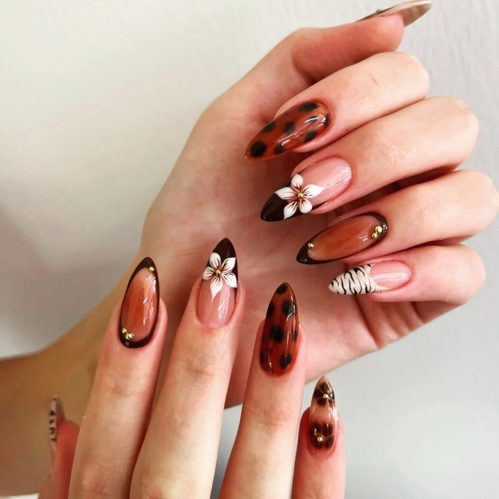 There’s something quietly confident about this almond shape that mixes warm tortoiseshell tones with delicate floral accents. It feels artistic without trying too hard, like a woman who knows her style and doesn’t need to explain it. The soft nude base keeps everything balanced, while the darker details add depth and personality. This look gives grown-up spring energy—creative, slightly playful, and very polished—making it perfect for anyone craving fresh Inspo without going overly bright.