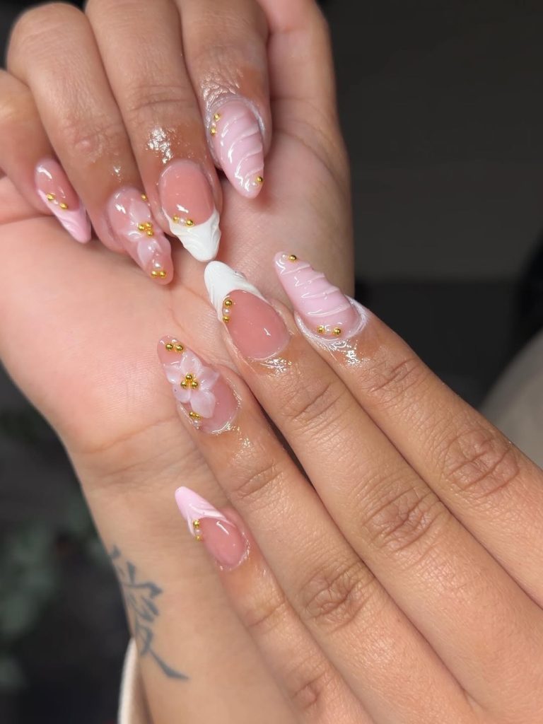 10. Pink Almond Nails with Blush Ombre and Floral Details