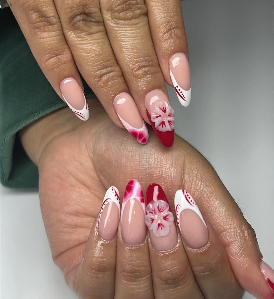 This design feels confident and artistic, with a soft blush effect that melts into deeper pink tones. The floral accents add structure and interest, giving the nails a polished yet creative finish. It’s bold enough to feel intentional but still gentle enough for everyday wear.
