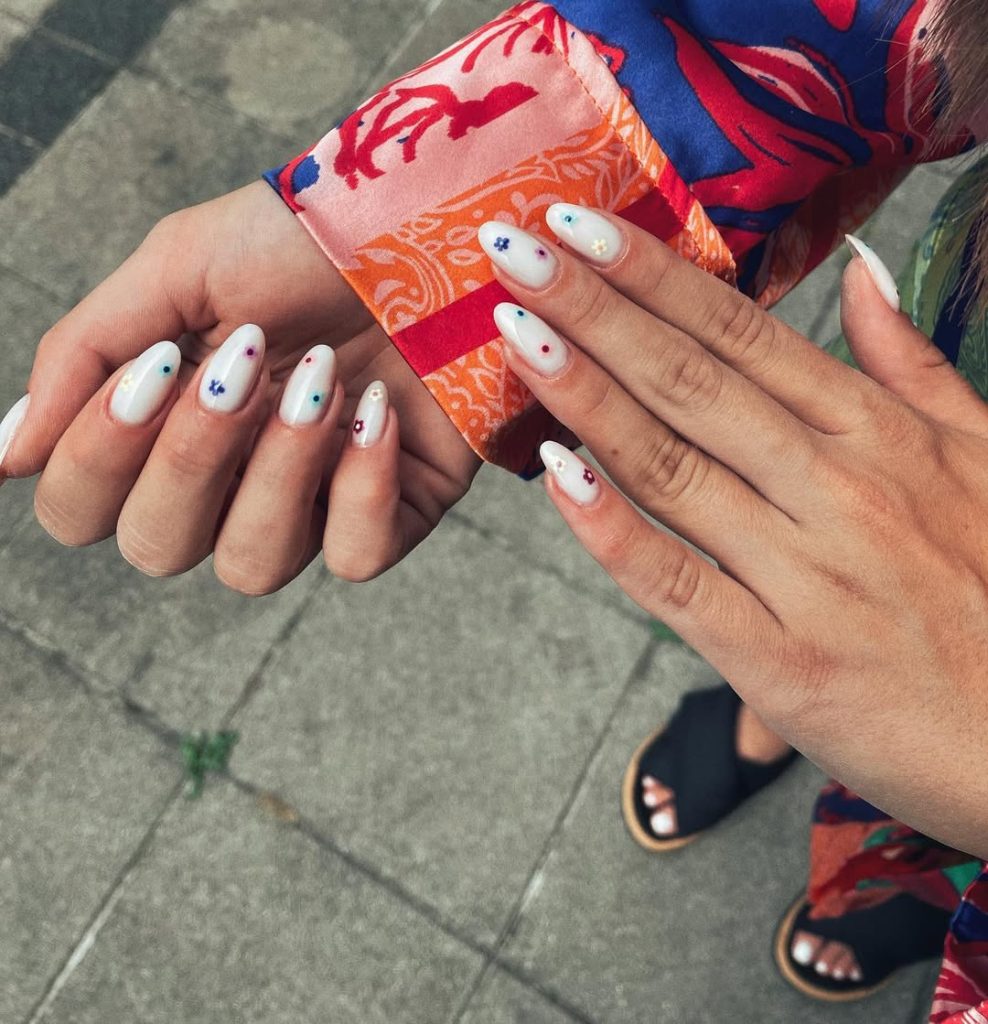 If you love low-maintenance beauty, this design is a smart choice. White almond nails make the fingers look longer, and the simple floral accents disguise minor chips as the nails grow out. It works especially well if you rotate between short and long lengths and want something that transitions easily. Pair it with neutral outfits or soft pastels for an effortlessly polished spring vibe.