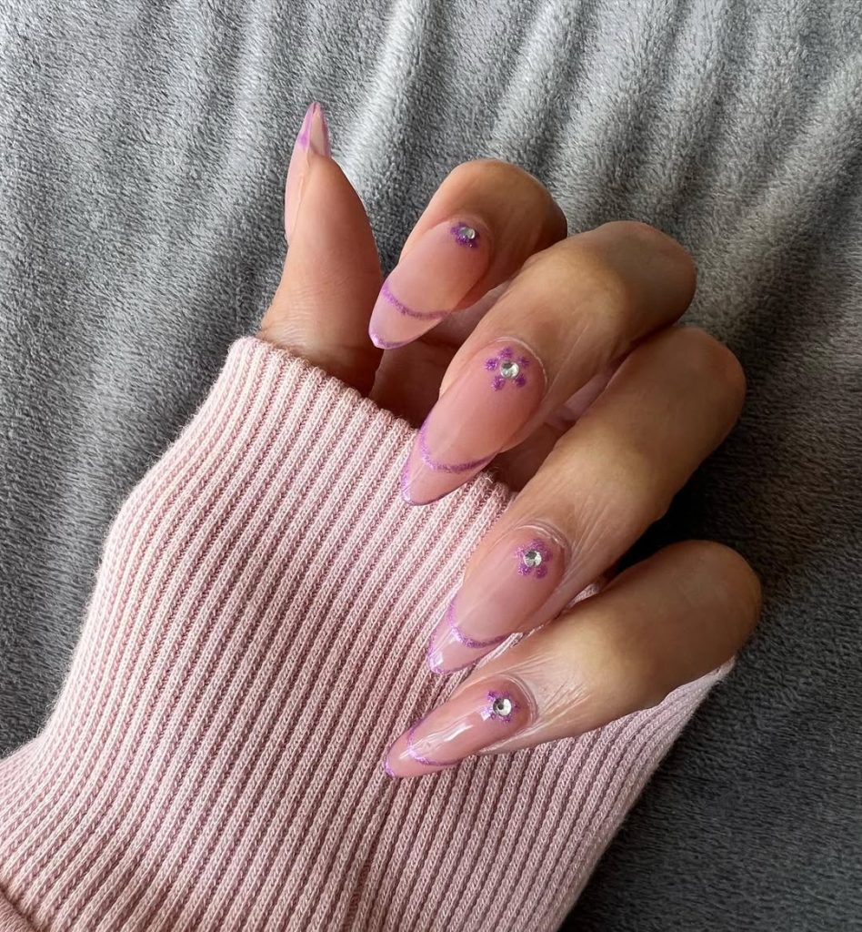 This design feels romantic in a very modern way. The sheer pink base keeps everything soft and natural, while the lilac French lines add just enough structure to feel intentional. It’s subtle, feminine, and quietly stylish—the kind of manicure that feels intimate, like a detail only you really notice, yet others still admire.