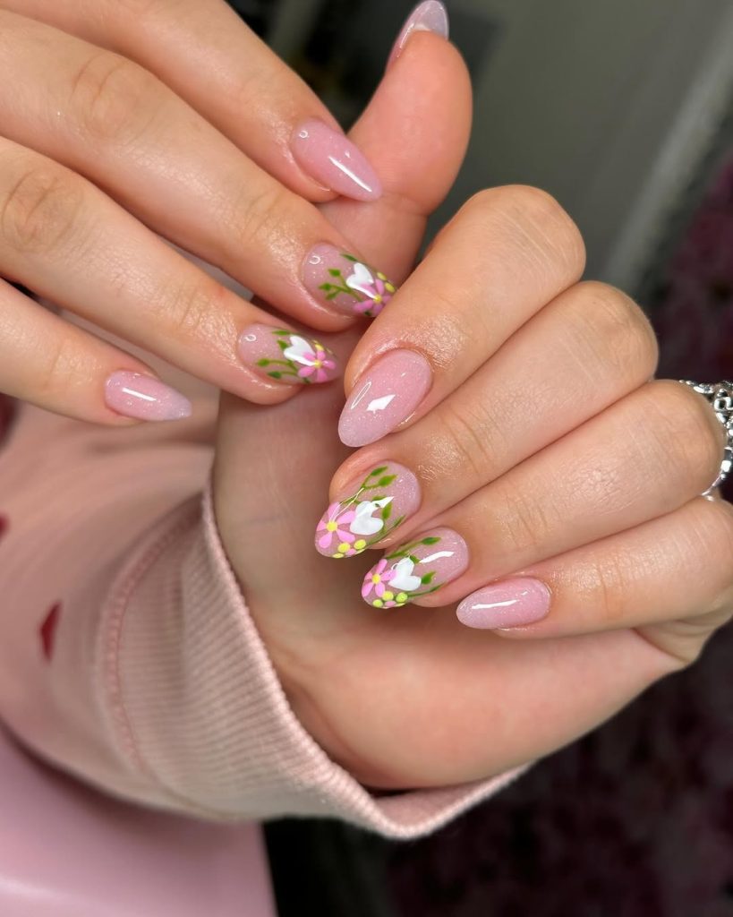 9. Light Pink Almond Nails with Hand-Painted Floral Art